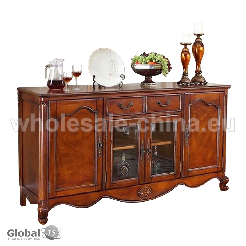 Nice model of sideboard cabinet will be a great decoration for any dining room. Artfully decorated front side creates an interesting optical illusion, impressively emphasizing original design. Low wooden stand securely holds a compact mini bar cabinet. Insidethere are special shelves for proper storage of various alcohol and glasses. Robust design of high-quality wood is able to serve for many years without losing the decorative appeal and the main technical characteristics.