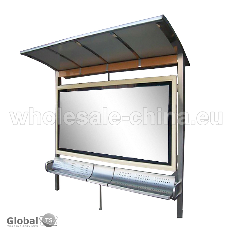 Bus stop shelter with light box. It has the following specifications: 1) Material: durable metal; 2) Power Consumption: low; 3) Frame material: aluminum, steel and other durable metal, tempered glass or PC endurance board; 4) Color design &Size: customized. This bus shelter is designed specially for public use, with a strong emphasis on safety and durability.