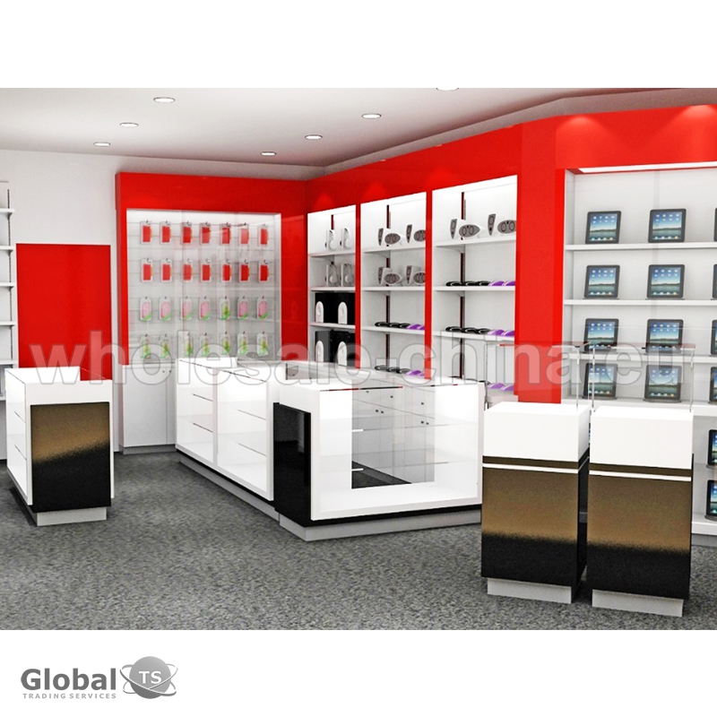 We offer modern and stylish design for your cell phone store. All materials are of high-quality. It can be made of MDF, tempered glass. Nice design of red and black colors will make your store unique. You may choose any size, colour material for its production.