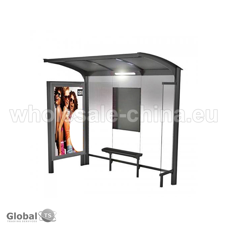 Bus stop shelter with light box. It has the following specifications: 1) Material: durable metal; 2) Power Consumption: low; 3) Frame material: aluminum, steel and other durable metal, tempered glass or PC endurance board; 4) Color design &Size: customized. This bus shelter is designed specially for public use, with a strong emphasis on safety and durability.